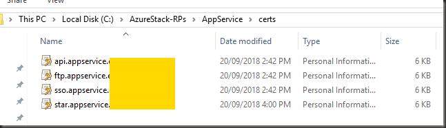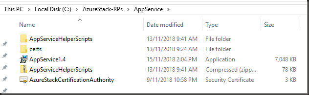 On my Cloud Operator VMI create a working folder for all resource providers and a subfolder for each RP: i.e. C:\AzureStack-RPs\AppService. I will refer to this as the working folder.