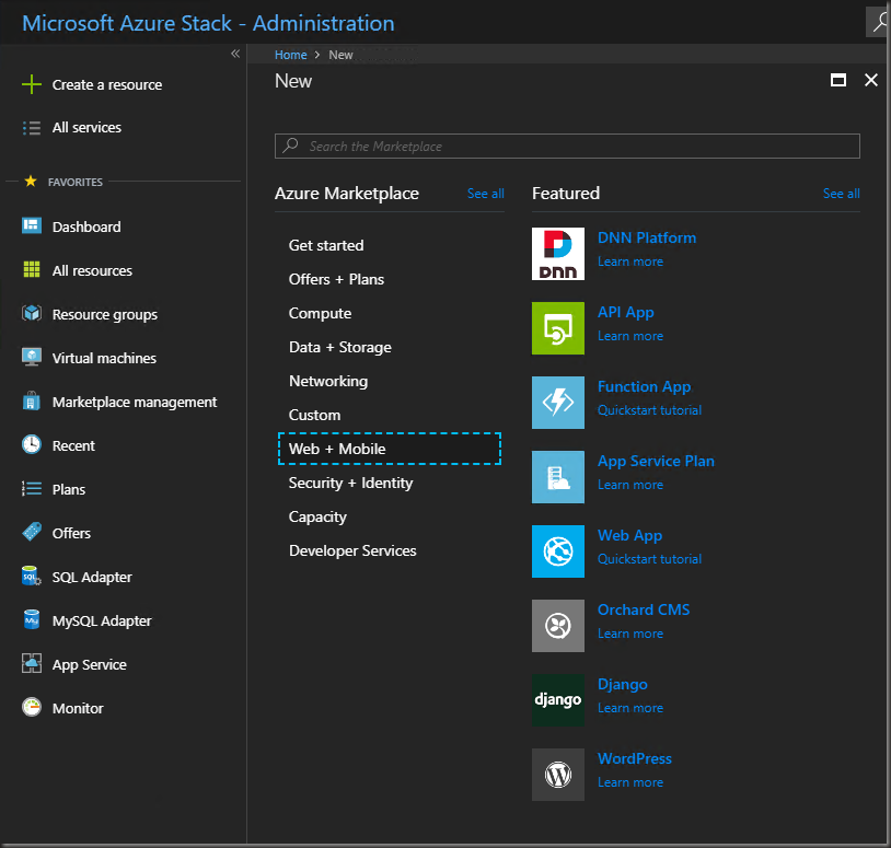 Select Create a resource > Web + Mobile and see your new available app services