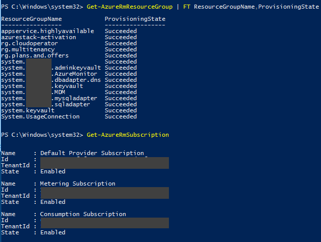 Run Get-AzureRMResourceGroup and Get-AzureRMSubscription to demostrate you’re connected to Azure Stack