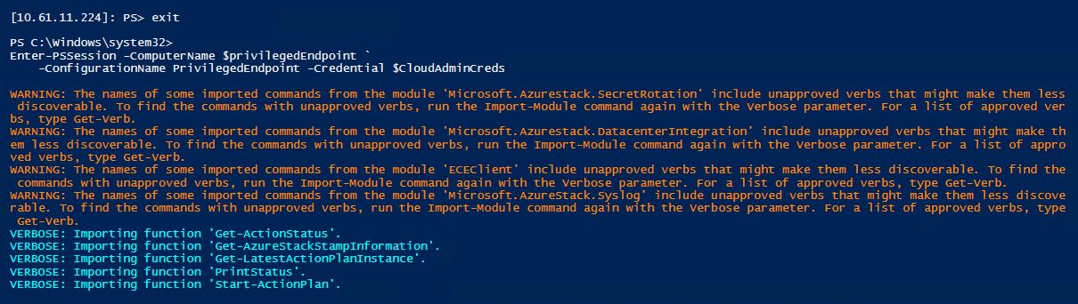 -ConfigurationName PrivilegedEndpoint -Credential $CloudAdminCreds