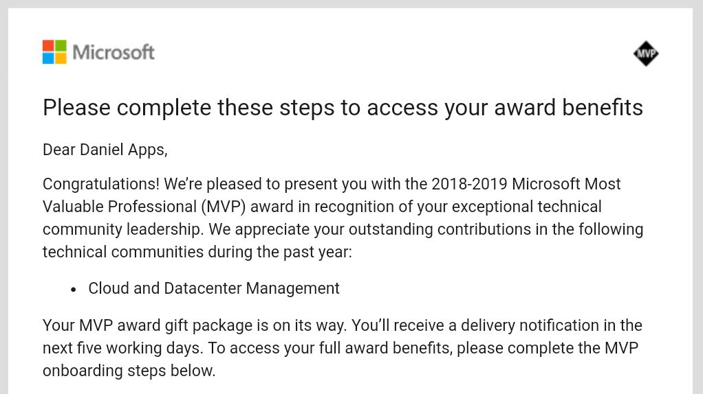 Today I was received an email advising that I’d been awarded the Most Valuable Professional (MVP) Award from Microsoft in Cloud and Datacenter Management.
