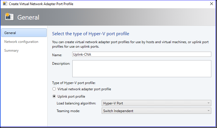 New-SCNativeUplinkPortProfile -Name "Uplink-CNA" `