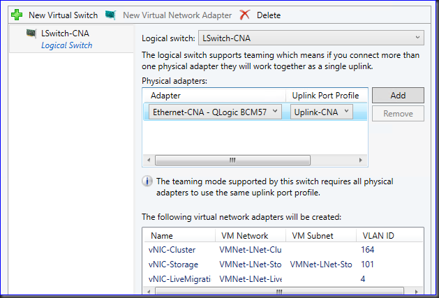 This walks through making a Port Profile, Creating a Logical Switch and defining Virtual Network Adapters to build a converged network adapter on your hosts.